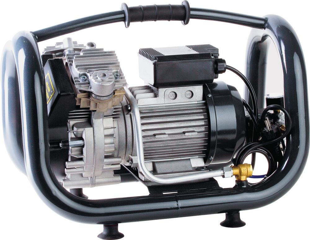 ölfrei · 2 Zylinder · V-Aggregat · durch die patentierte Ansaugluftkühlung für den Dauerlauf geeignet · Langsamläufer mit 1450 min¹ · Druckminderer und 2 Manometer · 1 DL-Anschluss mit Sicherheitsschnellkupplung · Kugelhahn zum Kondensatablass · NEMA Druckschalter mit Anlaufentlastung · Ventile aus Edelstahl · Schallleistungspegel 90, Schalldruckpegel 72 dB(A)