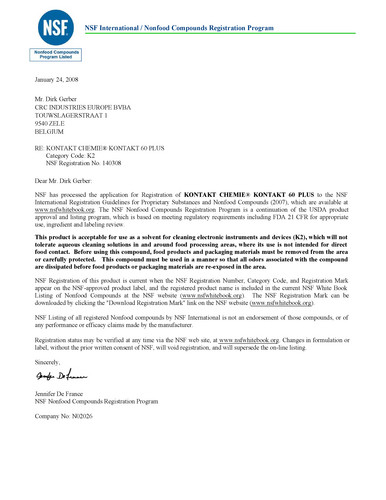 plus Schutz · oxidlösendes Kontaktreinigungsmittel in Kombination mit einem hochwertigen Gleit- und Schutzöl · sorgt für langanhaltenden, störungsfreien Betrieb elektrischer Geräte · löst Schmutz und selbst hartnäckige Oxidschichten und beseitigt störende Kontaktwiderstände · reduziert Steckkräfte und schützt vor Feuchtigkeit und Korrosion · ideal für Stecker, Schalter, Regler usw. insbesondere unter Witterungseinfluss · NSF K2-registiert für den Einsatz in der Lebensmittelindustrie (Reg.-Nr. 140308)