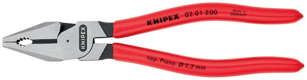 35 % Kraftersparnis gegenüber herkömmlichen Kombizangen · Greifzonen für Flach- und Rundmaterial · lange Schneiden für dickere Kabel · Schneiden zusätzlich gehärtet, Schneidenhärte ca. 63 HRC · Spezial-Werkzeugstahl in Sondergüte, geschmiedet, mehrstufig ölgehärtet