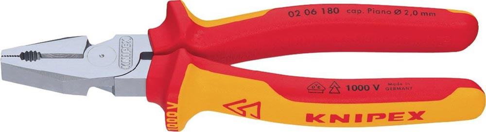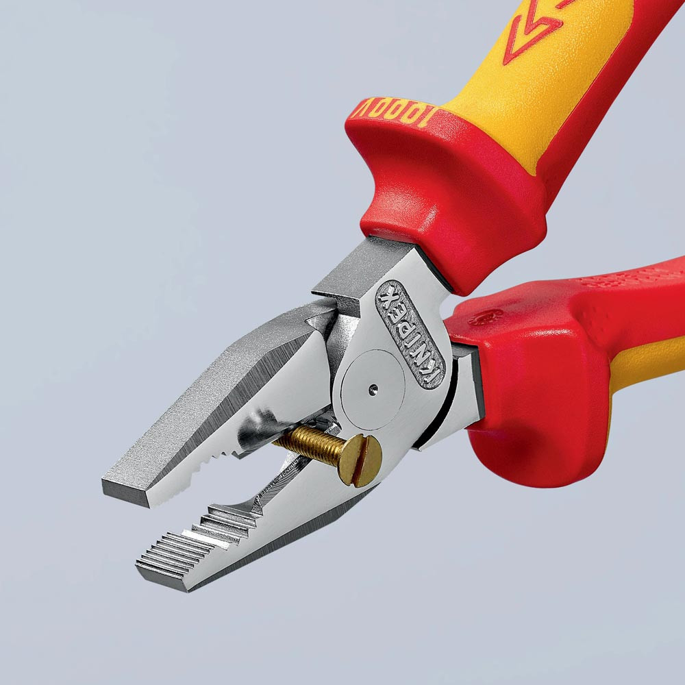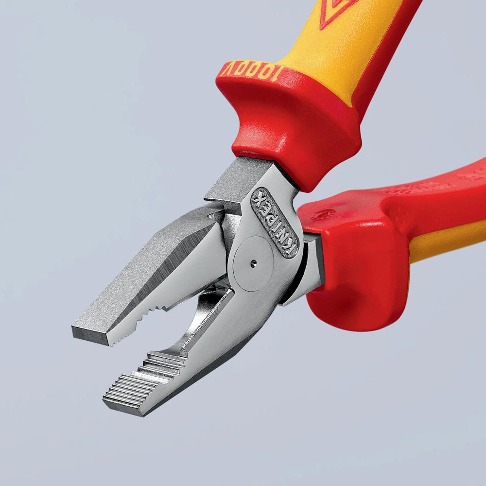 VDE-isoliert bis 1000 V · gefertigt gem. DIN EN/IEC 60900, stückgeprüft · 35 % Kraftersparnis gegenüber herkömmlichen Kombizangen · Greifzonen für Flach- und Rundmaterial · lange Schneiden für dickere Kabel · Schneiden zusätzlich gehärtet, Schneidenhärte ca. 63 HRC · Spezial-Werkzeugstahl in Sondergüte, geschmiedet, mehrstufig ölgehärtet