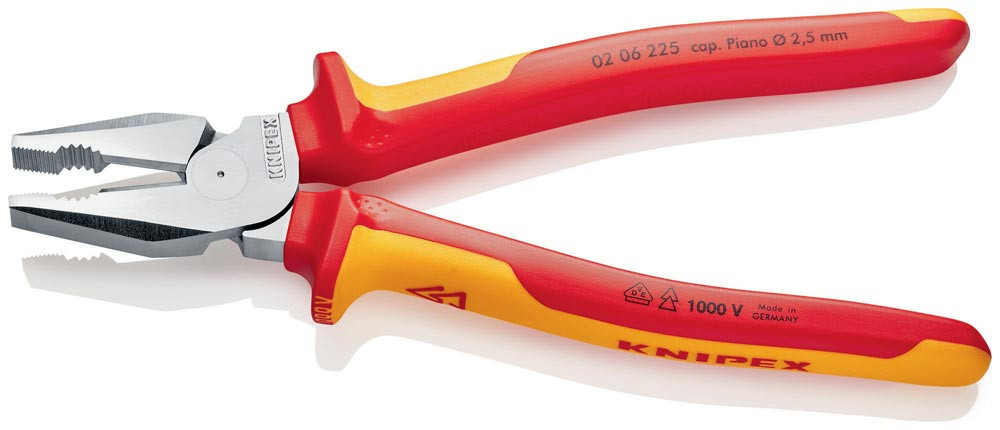VDE-isoliert bis 1000 V · gefertigt gem. DIN EN/IEC 60900, stückgeprüft · 35 % Kraftersparnis gegenüber herkömmlichen Kombizangen · Greifzonen für Flach- und Rundmaterial · lange Schneiden für dickere Kabel · Schneiden zusätzlich gehärtet, Schneidenhärte ca. 63 HRC · Spezial-Werkzeugstahl in Sondergüte, geschmiedet, mehrstufig ölgehärtet