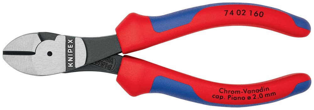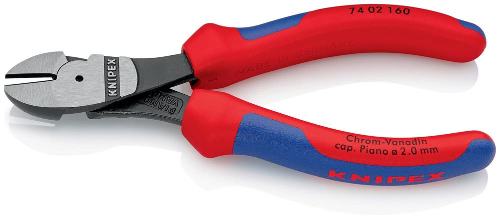 20 % Kraftersparnis gegenüber herkömmlichen Seitenschneider · Schneiden zusätzlich induktiv gehärtet, Schneidenhärte ca. 64 HRC · Chrom-Vanadin-Hochleistungsstahl, geschmiedet, mehrstufig ölgehärtet