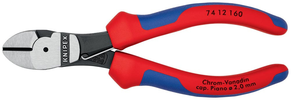 20 % Kraftersparnis gegenüber herkömmlichen Seitenschneider · mit Öffnungsfeder · Schneiden zusätzlich induktiv gehärtet, Schneidenhärte ca. 64 HRC · Chrom-Vanadin-Hochleistungsstahl, geschmiedet, mehrstufig ölgehärtet