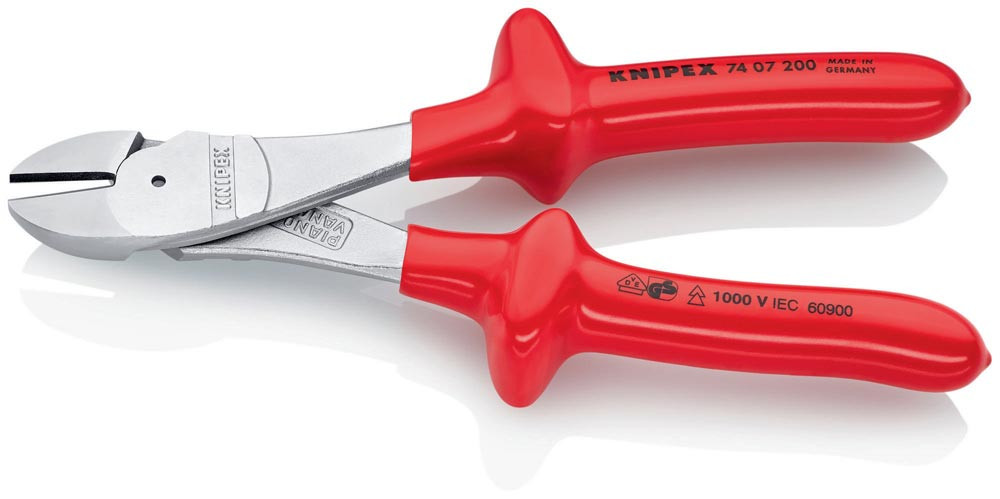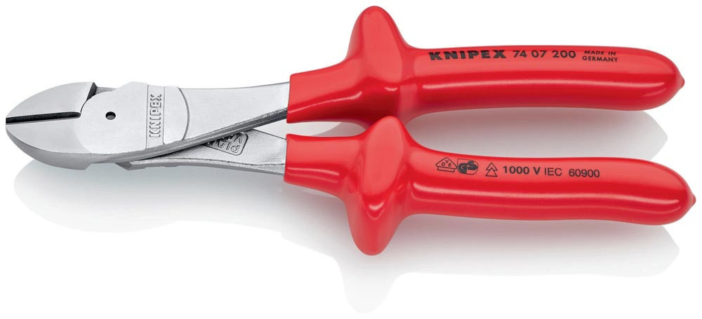 VDE-isoliert bis 1000 V · gefertigt gem. DIN EN/IEC 60900, stückgeprüft · 20 % Kraftersparnis gegenüber herkömmlichen Seitenschneider · Schneiden zusätzlich induktiv gehärtet, Schneidenhärte ca. 64 HRC · Chrom-Vanadin-Hochleistungsstahl, geschmiedet, mehrstufig ölgehärtet