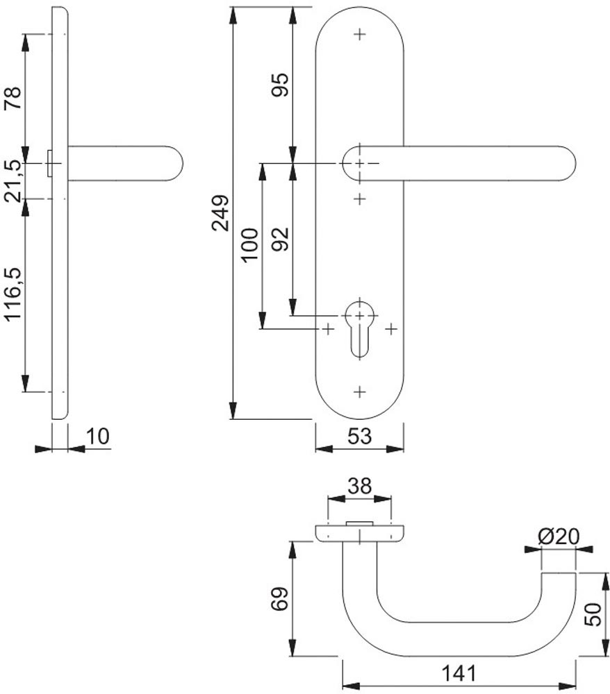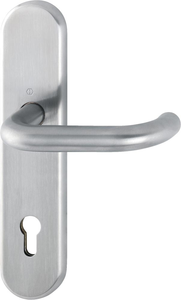 für Kombischutz · Edelstahl-Langschild-Türgriff-Halbgarnitur für Außen-/Wohnungsabschluss-Türen (Innenseite) · Lagerung: Türgriff fest/drehbar, wartungsfreies Gleitlager · Verbindung: für HOPPE-Spreizstift (separat bestellen) bei einseitig gebohrten Türen · Unterkonstruktion: Stahl · Befestigung: verdeckt, Mehrzweckschrauben · Besonderheit: kombinierbar mit runden oder quadratischen HOPPE-Schutzrosetten an der Türaußenseite · Lochung PZ · DIN links / rechts