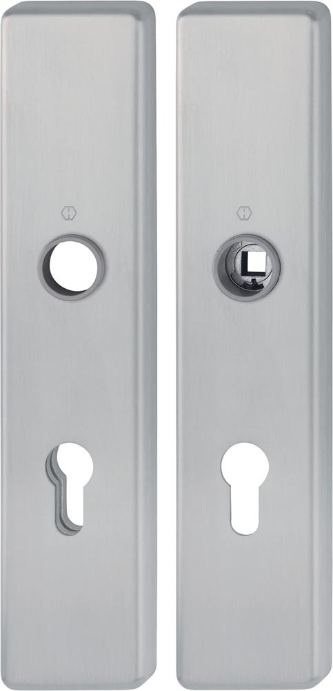 Das Schutz-Langschild-Paar ist ausschließlich mit HOPPESchnellstift-Türgriff-Lochteilen kombinierbar und entspricht nur so den Anforderungen der Schutzklasse ES1 (SK2).