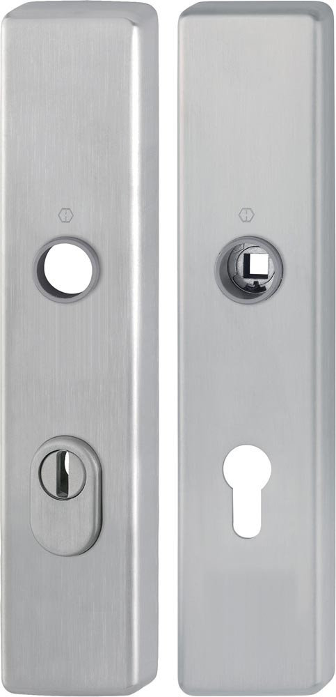 Das Schutz-Langschild-Paar ist ausschließlich mit HOPPESchnellstift-Türgriff-Lochteilen kombinierbar und entspricht nur so den Anforderungen der Schutzklasse ES1 (SK2).