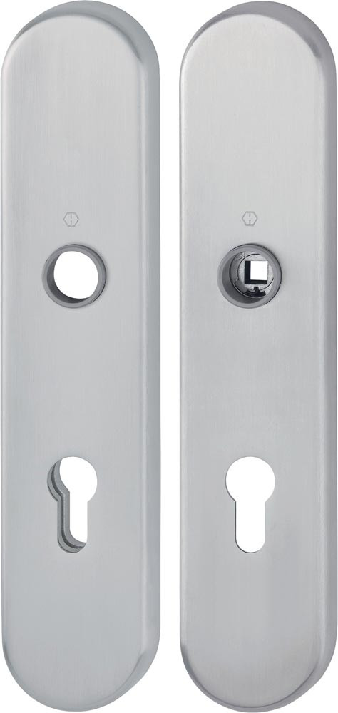 Das Schutz-Langschild-Paar ist ausschließlich mit HOPPESchnellstift-Türgriff-Lochteilen kombinierbar und entspricht nur so den Anforderungen der Schutzklasse ES1 (SK2).