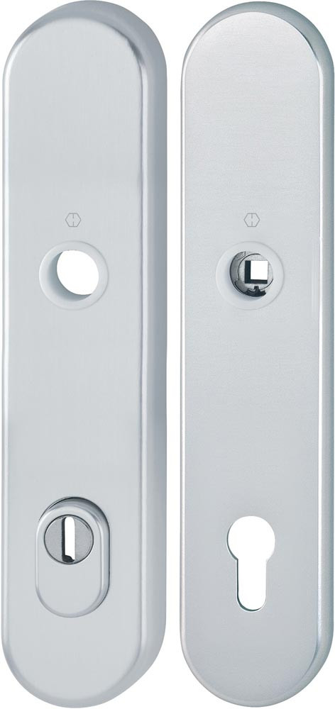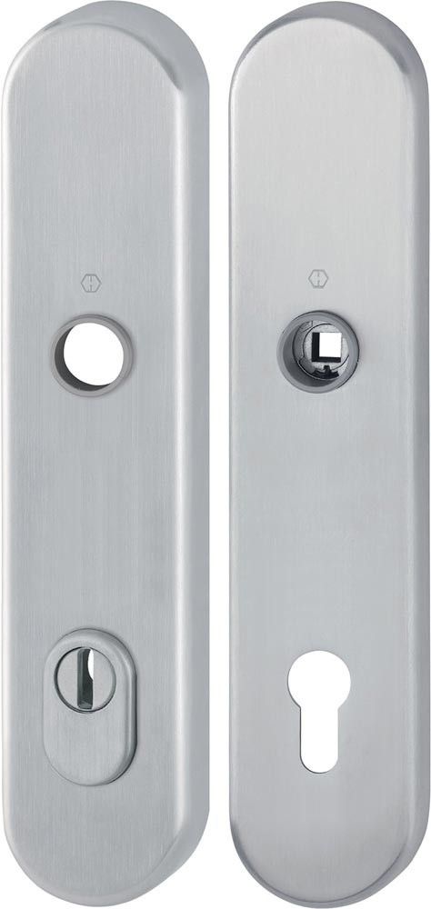 Das Schutz-Langschild-Paar ist ausschließlich mit HOPPESchnellstift-Türgriff-Lochteilen kombinierbar und entspricht nur so den Anforderungen der Schutzklasse ES1 (SK2).