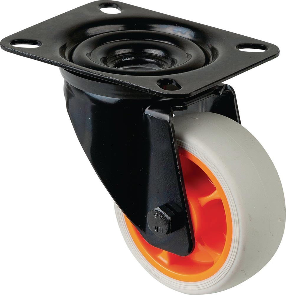 Transportgeräterolle · Gehäuse aus Stahlblech, schwarz · zweireihiger Kugelkranz im Gabelkopf · thermoplastisches Gummirad hellgrau · Radkörper Kunststoff orange · Rollenlager · mit Plattenbefestigung