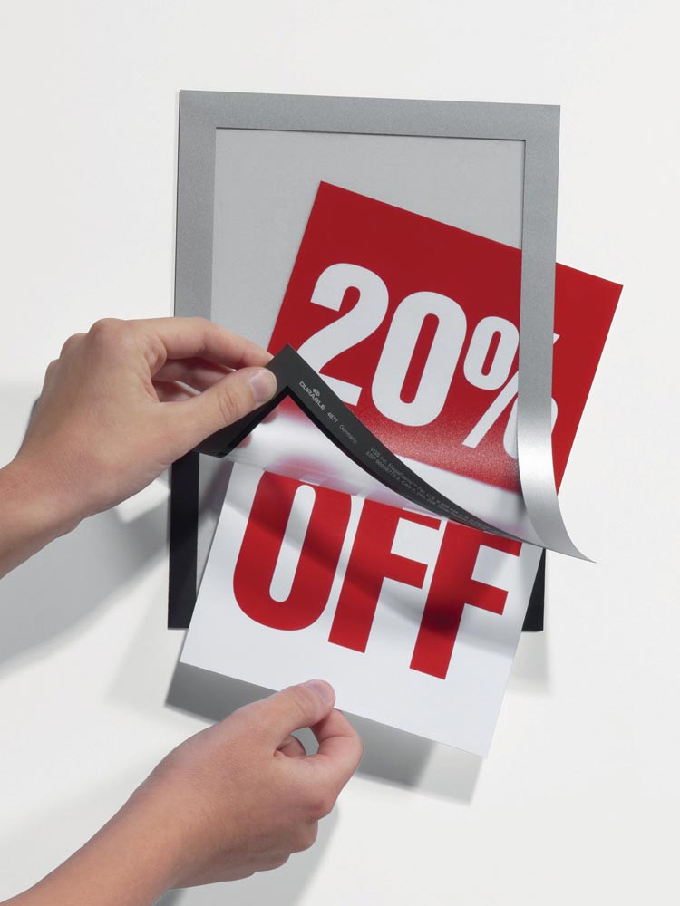 selbstklebend · mit vollflächiger Selbstklebefolie auf der Rückseite, zur Anbringung auf glatten Oberflächen · der Rahmen lässt sich rückstandslos lösen und an anderer Stelle wieder anbringen · Rahmen beidseitig farbig · einfaches und schnelles Austauschen durch aufklappbare, magnetische Vorderseite · auf Glasflächen beidseitig lesbar · VE = 2 Stück