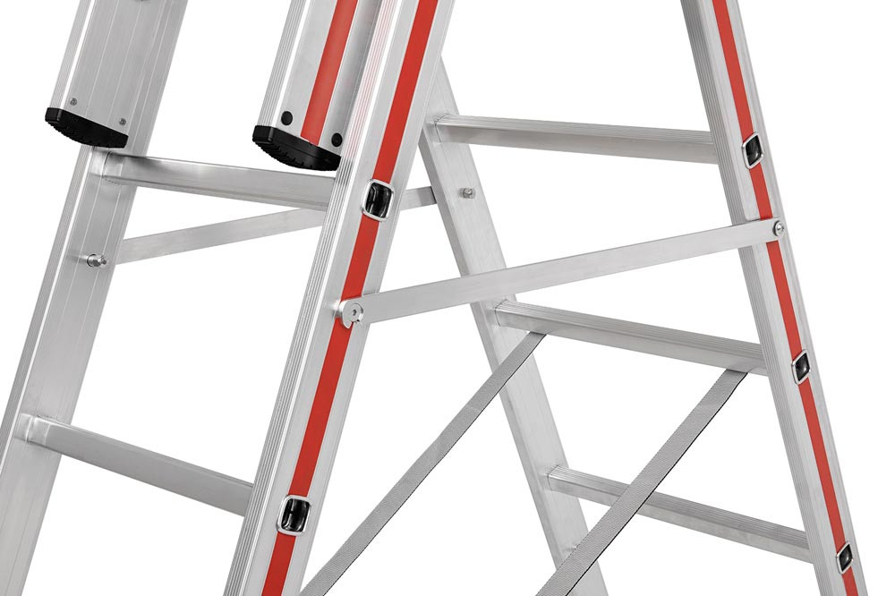 ∙ Multifunktionale Verwendung ∙ Oberteil bestehend aus Stufen mit 80 mm Stufentiefe, Unter- und Mittelteil aus Sprossen mit stark profiliertem Strangpressprofil ∙ Komforttables Ausfahren der Leiter mittels Wandlaufrollen ab Größe 3 x 8 ∙ Aushängbare, starre Strebe verhindert unbeabsichtiges Zusammenklappen ∙ Mehr Bodenfreiheit und sicherer Stand dank gebogener Traverse · Zulässige Belastung 150 kg · Entspricht EN 131