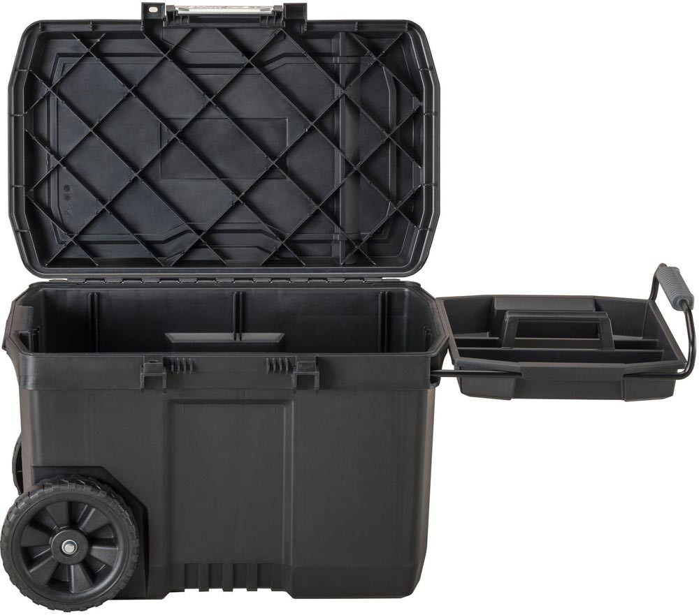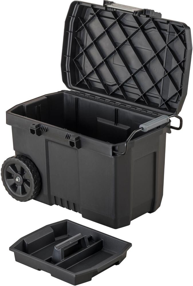 Kunststoff · schnelles Öffnen und Schließen des Deckels mit einer Hand · entnehmbare Ablage für die Organisation von Kleinteilen · Deckel mit IP53 Nässe- und Staubschutz · robuster Teleskopgriff für leichten und komfortablen Transport · 52 l Fassungsvolumen