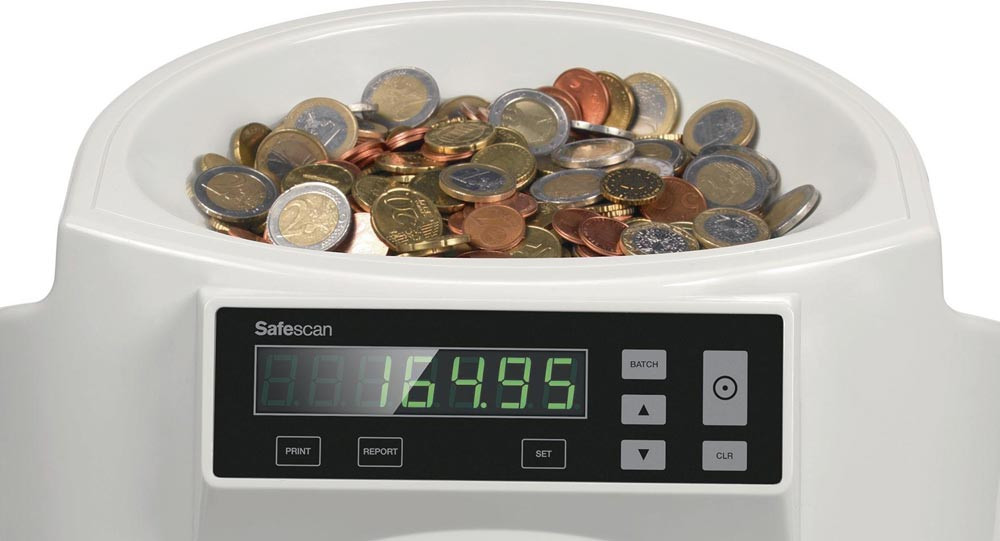 schnelles und einfaches Zählen und Sortieren von Euro Münzen · der große Aufnahmetrichter kann bis zu 500 Münzen aufnehmen und zählt mit einer Geschwindigkeit von bis zu 220 Münzen pro Minute · alle Münzen in den Aufnahmetrichter schütten - eine vorherige Sortierung ist nicht erforderlich - und auf Start drücken