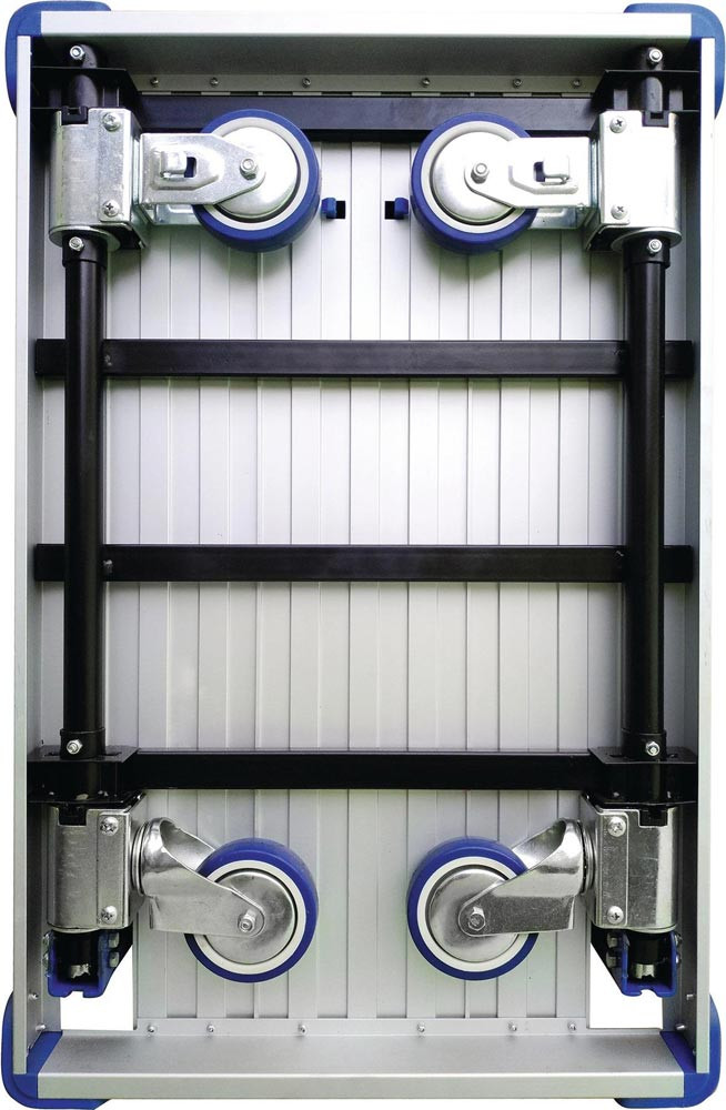 robuste Plattform aus Aluminium · Kunststoff-Stoßschutzecken · Dokumententasche am Schiebebügel · gepolsterter Griffbereich · Schiebebügel auszieh- und klappbar · TPR Bereifung, spurlos · 2 Lenk- und 2 Bockrollen · Räder klappen automatisch ein und aus · zusammengeklappt nur 90 mm hoch · Anwendung: Zum Verstauen einfach den Schiebebügel runterklappen und die Räder schwenken automatisch ein