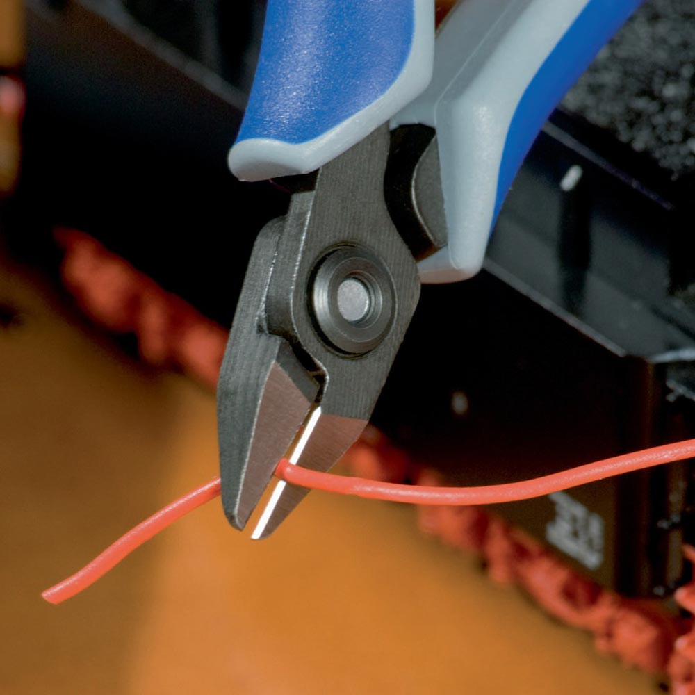 für feinste Schneidarbeiten z. B. in Elektronik und Feinmechanik · geschliffene, scharfe Schneiden · Schneiden zusätzlich induktiv gehärtet, Schneidenhärte ca. min. 64 HRC · ca. 20% weniger Gewicht · geschraubtes Gelenk · Öffnungsfeder · Chrom-Vanadin-Kugellagerstahl, geschmiedet, mehrstufig ölgehärtet