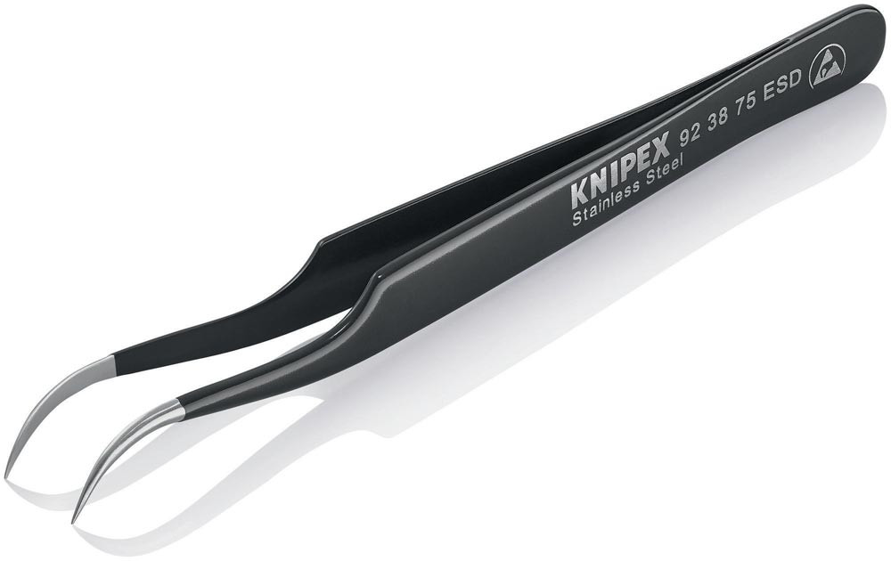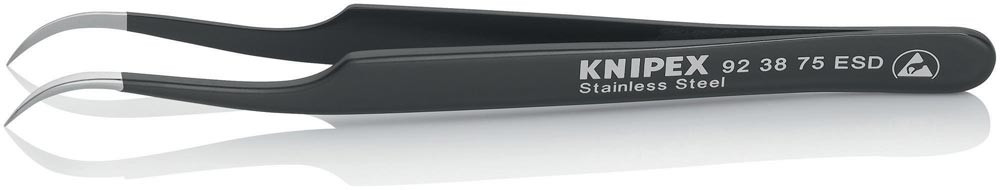 ESD-Beschichtung: blendfrei schwarz, mit einem Oberflächenwiderstand von ca. 105 Ohm · Spitzen blendfrei gebürstet · Greifflächen mattiert für optimalen Halt · Chrom-Nickel-Stahl, rostfrei, antimagnetisch (18/10)