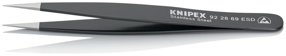 ESD-Beschichtung: blendfrei schwarz, mit einem Oberflächenwiderstand von ca. 105 Ohm · Spitzen blendfrei gebürstet · Greifflächen mattiert für optimalen Halt · Chrom-Nickel-Stahl, rostfrei, antimagnetisch (18/10)
