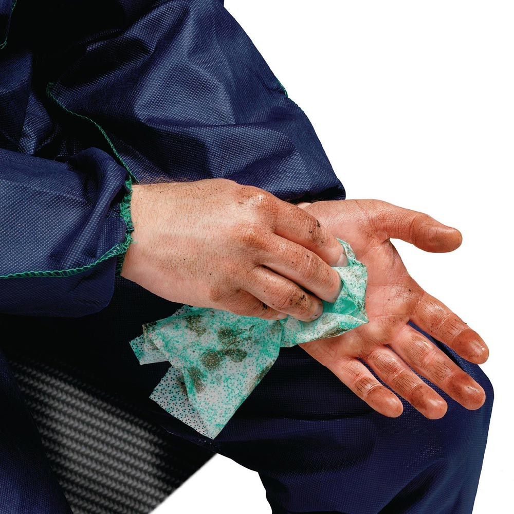 feuchte Handreinigungstücher in mobilem Spender mit Einzeltuchentnahme · intensive Handreinigung ohne Wasser und Seife · immer und überall einsetzbar · der Schmutz wird aufgebrochen, gelöst und im Tuch gebunden · mit Aloe vera als Feuchtigkeitsspender für Ihre Hände eignet sich ideal für den Einsatz in Industrie und Gewerbe, um Hände und Werkzeug effizient zu säubern · VE = 1 Spendereimer à 90 Tücher bzw. Nachfüllpackung à 75 Tücher