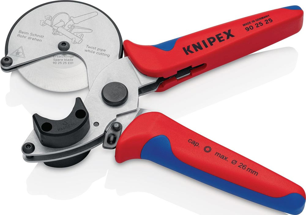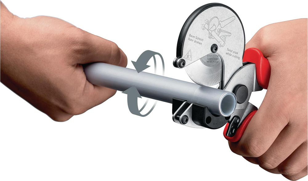 für Verbund- und Kunststoffrohre · frei drehbares Schneidrad für reibungsarmes Drehen des Rohrs · Rotationsbewegung ermöglicht müheloses Eindringen des Schneidrads bei minimierter Verformung des Rohrs · breite Kunststoff-Formauflagen für perfekt rechtwinklige Abschnitte · auch für Verbundrohre mit erhöhter Aluminiumschichtdicke (etwa Geberit Mepla) · mit Verschlussmechanismus