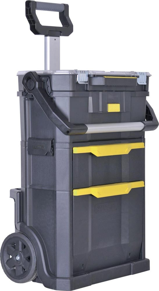 aus robustem Kunststoff · Obere Einheit: 19 Zoll Werkzeugtrage mit Organizeraufsatz · Mittlere Einheit: tiefe, kugelgelagerte Schublade, fest verbunden mit der unteren Einheit · Untere Einheit: mit zwei Fächern an der Rückseite zur Aufbewahrung größerer Werkzeuge · robuster und belastbarer Teleskopgriff aus Aluminium
