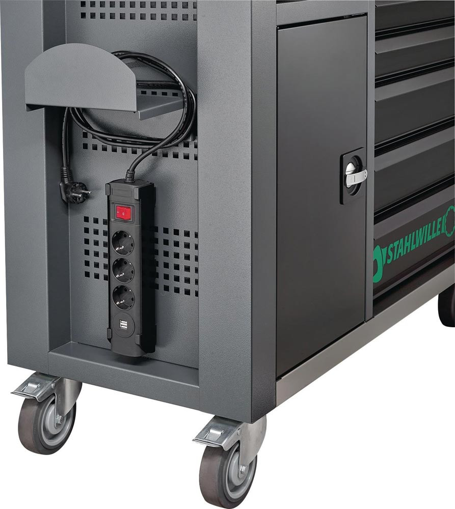 dreistufiges Sicherheits-Konzept · Zentralverriegelung durch seitliches Zylinderschloss mit abklappbarem Schlüssel · Einzelverriegelung verhindert unbeabsichtigtes Öffnen während der Fahrt · Kippschutz · gleichzeitiges Herausziehen mehrerer Schubladen nicht möglich · Birke-Multiplex-Arbeitsplatte 30 mm · FSC-zertifiziert · separates abschließbares Schrankteil mit Magnethalterung und höhenverstellbaren Zwischenboden (70 mm Raster) · Schubladen und Schrankteil gleich schließend · Verkabelung durch zwei gummierte Durchführungen und abnehmbaren Kabelkanal auf der Rückseite möglich · öl- und säurebeständige Räder (Ø 125 mm) mit Fadenschutz · mit zwei Feststellbremsen · Korpus RAL 7016 · Schubladen und Schrankteil RAL 9005 · Pulverbeschichtung · Papierrollenhalterung · seitliches Lochraster