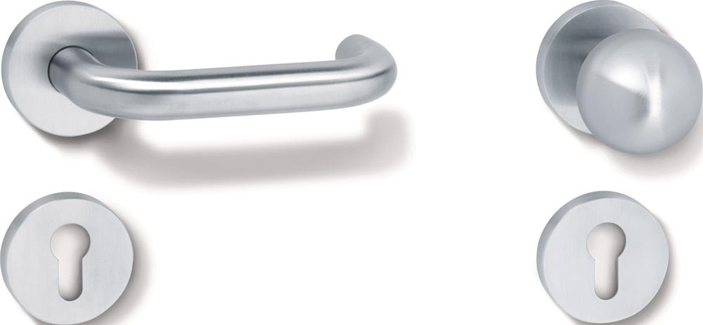 Knopf Modell 109X aus Edelstahl und Türdrücker Modell 111X aus Edelstahlrundrohr (1.4301), Durchmesser 21,3 mm mit 1,5 mm Wandstärke, mit Ansatzführung und Rastnut, mit Madenschraube M5 als zusätzliche Fixierung der Türdrücker mit dem Vierkantstift zur optimalen Kraftübertragung in das Türblatt. Montage durch einfaches Einrasten der Türdrücker in die auf der Tür vormontierten Unterteile.