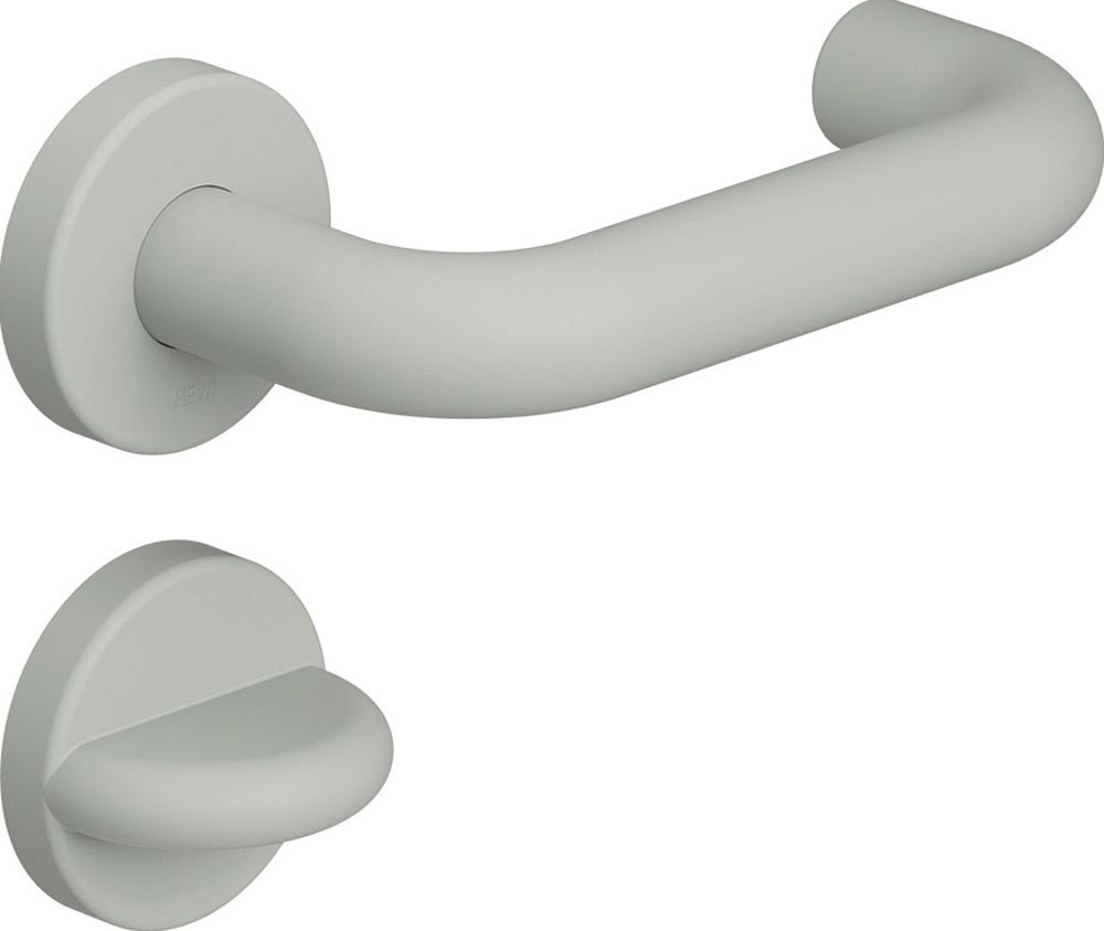 HEWI Frei-Besetzt-Garnitur in R-Technik · nach DIN 18255 und DIN EN 1906 · aus Polyamid · bestehend aus: Türdrücker 111.23PBR, Durchmesser 23 mm und Rundrosetten 305.23PBR und 306.23PBNR · WC-Ausführung mit Schauscheibe (Anzeige rot/weiß) und Notöffnung mittels Münze auf der Außenseite · Vierkant 8 mm · DIN links / rechts · der Drücker erfüllt die Vorgaben der DIN EN 179 und der DIN 18040 · Gebrauchs-Kategorie nach DIN EN 1906 - Klasse 4 · Edition matt