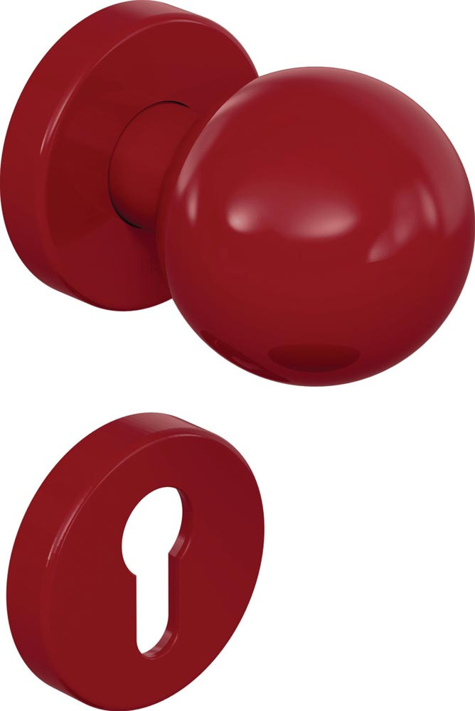 Knopf Modell 123.23R aus Polyamid und Türdrücker in U-Form aus Polyamid mit durchgehendem Stahlkern bis in das Drückerende, durchgängig eingefärbt, Durchmesser 20 mm, mit Ansatzführung und Rastnut, Montage durch einfaches Einrasten der Türdrücker in die auf der Tür vormontierten Unterteile.