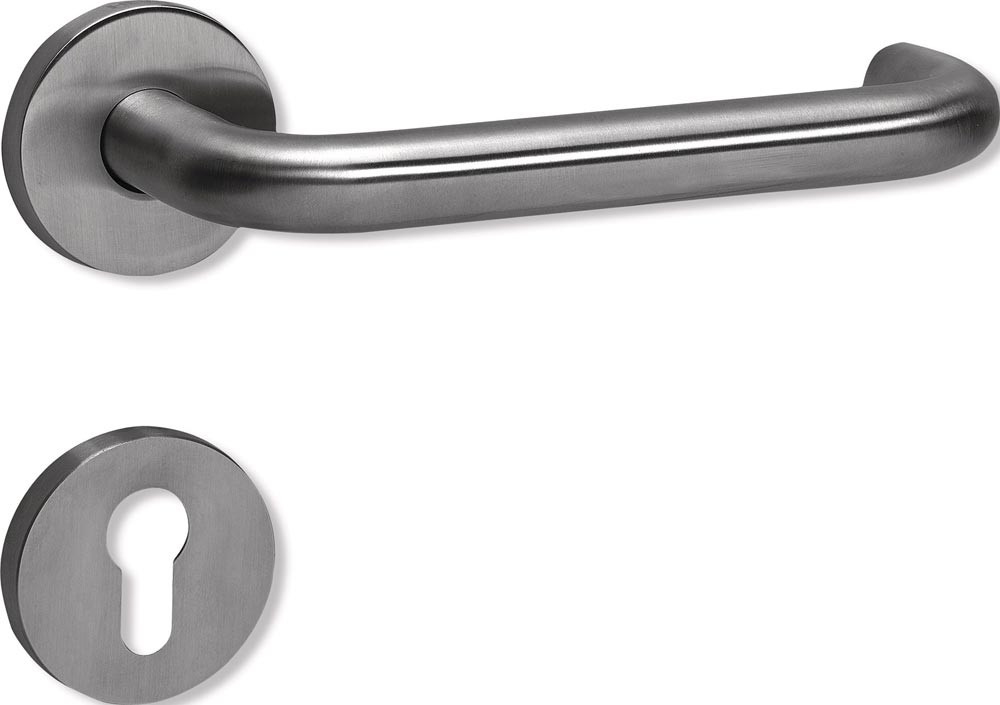 Zimmergarnitur · in H-Technik nach DIN 18255 und DIN EN 1906 aus Edelstahl, Oberfläche matt geschliffen, bestehend aus: Türdrücker 112XAH, Durchmesser 21,3 mm, Rundrosetten 305.21XAH und 306.23XA, mit integriertem Hochhaltemodul mit Federunterstützung · der Drücker erfüllt die Vorgaben der DIN EN 179 und DIN 18040 · Gebrauchskategorie: Klasse 4 Garnitur mit Vierkantstift 8 - 8,5 mm · Ausführungsvorschlag! Bitte alle Maße und baulichen Gegebenheiten im Auftragsfall prüfen!
