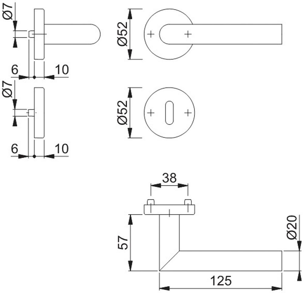 Rosetten-Garnitur mit Schlüsselrosetten für Innentüren · geprüft nach DIN EN 1906: 47-0150A und PIVCERTPlus (1.000.000 Prüfzyklen), Objekt-Garnitur (Gebrauchs-Kategorie Klasse 4) · Lagerung: Türgriffe fest/drehbar (Wechselgarnitur: außen Knopf fest), Rückholfedern, HOPPE-Steckgriff-Verbindung mit Kugel-Arretierung Sertos®, wartungsfreie Gleitlager · Verbindung: HOPPE-Profilvollstift (Drückergrt.) / HOPPE-FDW-Profilvollstift (Wechselgrt.), gehärtet · Unterkonstruktion: Griff-/Knopfrosetten Stahl, Schlüsselrosetten Kunststoff, Stütznocken · Befestigung: verdeckt, durchgehend · Griff-/Knopfrosetten Gewindeschrauben M5 · Schlüsselrosetten Mehrzweckschrauben, wechselseitig · TS 40 - 45 mm