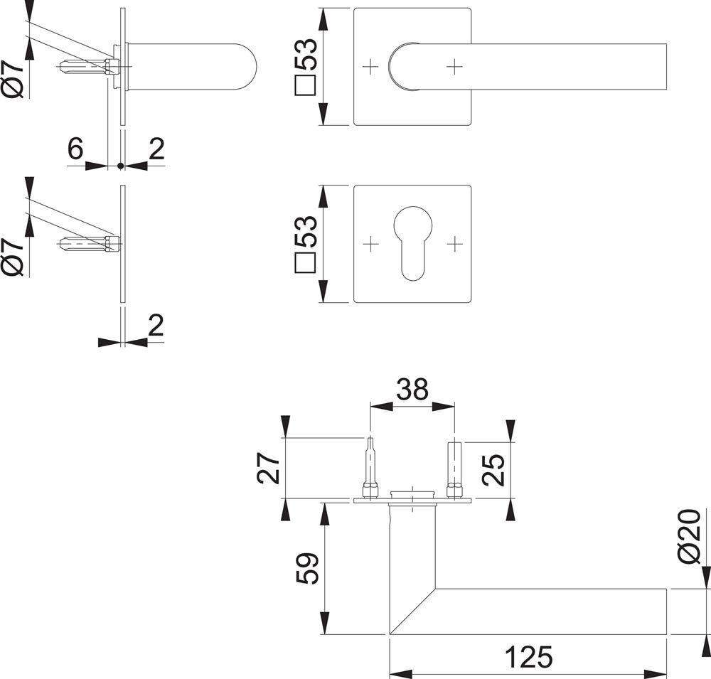 Befestigung: aufsteckbare Griffrosetten mit Stütznocken, aufsteckbare Schlüsselrosetten mit durchgehenden Stütznocken