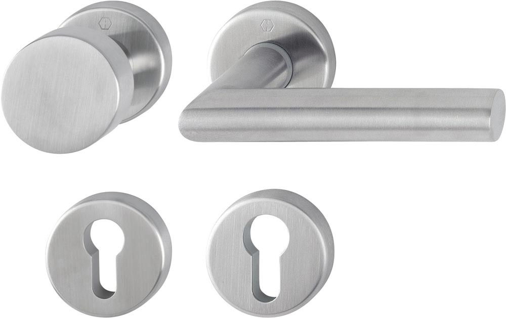 Innentür-Rosetten-Garnitur geprüft nach DIN EN 1906 (Gebrauchs-Kategorie Klasse 3) · Edelstahl, matt · Türgriffe mit Schnellstift-Verbindung (mit 8 mm Vollstift) für Türstärke 37-42 mm · Rosetten mit Kunststoff-Unterkonstruktion, Rückholfeder und Stütznocken · verdeckte, durchgehende Verschraubung mit selbstschneidenden Gewindeschrauben · Anschlagrichtung DIN links / rechts