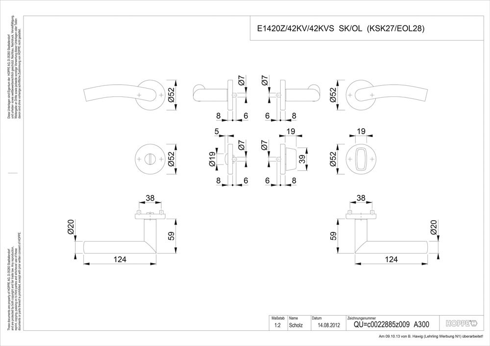 Rosetten-Garnitur mit Schlüsselrosetten · geprüft nach DIN EN 1906: 37-0140A (Gebrauchs-Kategorie Klasse 3), Objekt-Garnitur · Lagerung: Türgriffe lose, Rückholfedern rechts/links verwendbar , wartungsfreie Gleitlager · mit Schnellstift-Verbindung bei D/D mit HOPPE-Vollstift (Loch-/Lochteil), bei K/D mit HOPPE-FDW-Vollstift (Lochteil)· Unterkonstruktion: Kunststoff, Stütznocken · Befestigung: verdeckt, durchgehend, wechselseitig, Mehrzweckschrauben