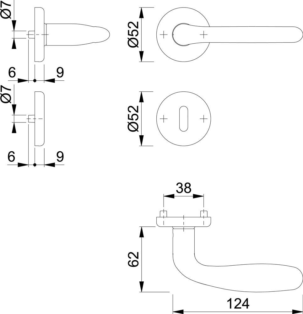 für Zimmertüren · verdeckte, durchgehende Verschraubung mit selbstschneidenden Gewindeschrauben · Kunststoff-Unterkonstruktion mit Stütznocken · mit Hochhaltefeder · Türgriff mit Profilstift-Verbindung · Vierkant 8 mm · für Türstärke 37 - 42 mm · Anschlagrichtung DIN links / rechts