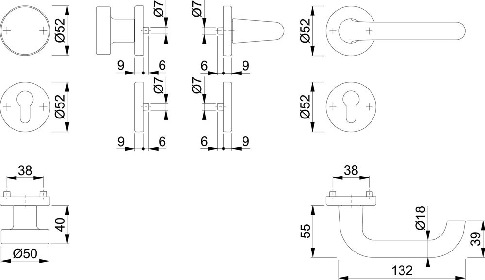 Innentür-Rosetten-Garnitur geprüft nach DIN EN 1906 (Gebrauchs-Kategorie Klasse 3) · Türgriffe mit Schnellstift-Verbindung (mit 8 mm Vollstift) für Türstärke 37-42 mm · Rosetten mit Kunststoff-Unterkonstruktion, Rückholfeder und Stütznocken · verdeckte, durchgehende Verschraubung mit selbstschneidenden Gewindeschrauben · Anschlagrichtung DIN links / rechts