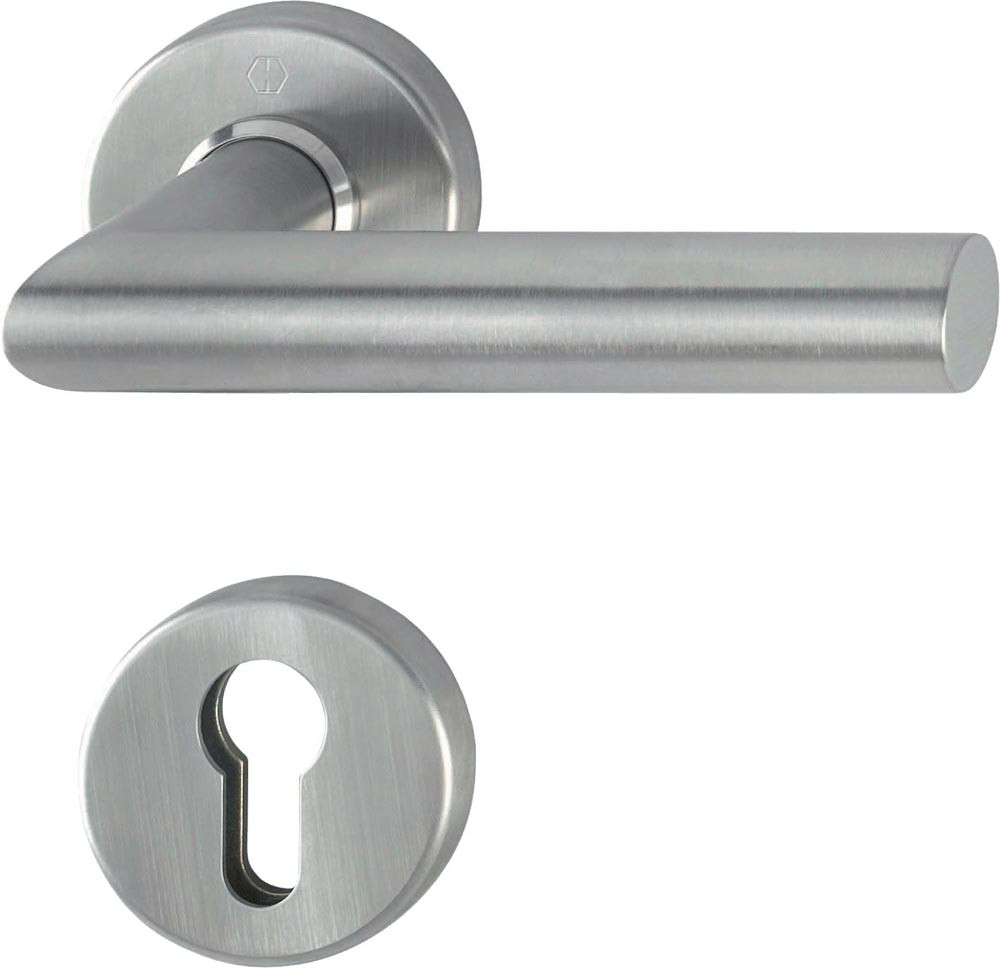 für Kombischutz · Edelstahl-Rosetten-Türgriff-Halbgarnitur mit Schlüsselrosette für Außen-/Wohnungsabschluss-Türen (Innenseite) · Lagerung: Türgriff lose, wartungsfreies Gleitlager · Verbindung: Schnellstift mit Vollstift (separat bestellen) · Unterkonstruktion: Stahl, Stütznocken · Befestigung: verdeckt, durchgehend, für Gewindeschrauben M5 · Besonderheit: kombinierbar mit Knopflangschild ES1 (SK2) für Kombi-Schutz · DIN links / rechts