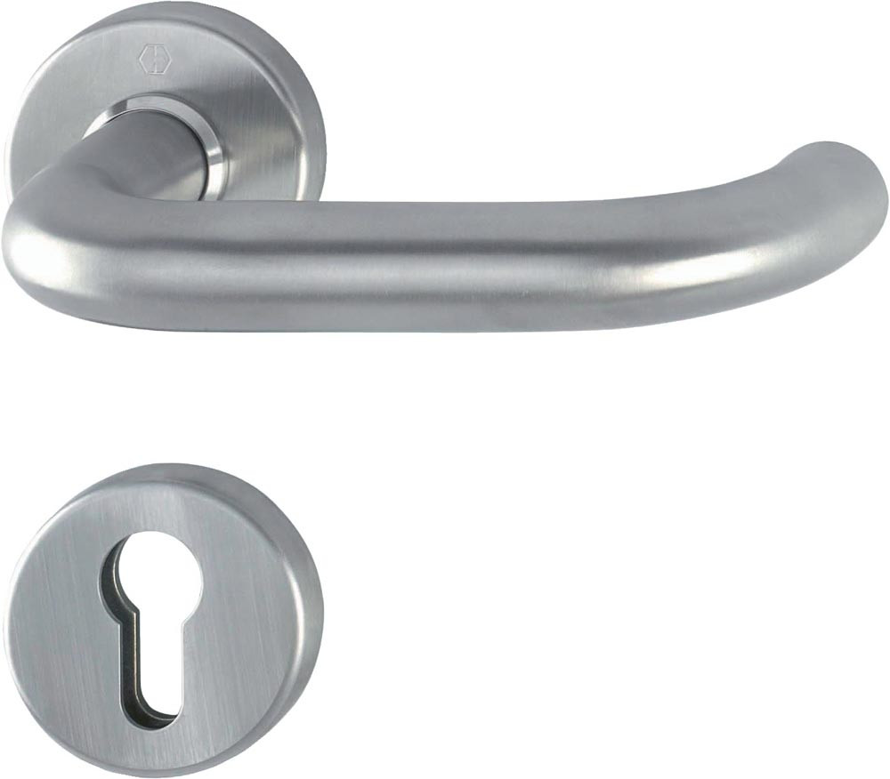 für Kombischutz · Edelstahl-Rosetten-Türgriff-Halbgarnitur mit Schlüsselrosette für Außen-/Wohnungsabschluss-Türen (Innenseite) · Lagerung: Türgriff lose, wartungsfreies Gleitlager · Verbindung: Schnellstift mit Vollstift (separat bestellen) · Unterkonstruktion: Stahl, Stütznocken · Befestigung: verdeckt, durchgehend, für Gewindeschrauben M5 · Besonderheit: kombinierbar mit Knopflangschild ES1 (SK2) für Kombi-Schutz · DIN links / rechts