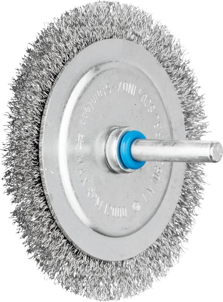 zum Reinigen, Entrosten, Glätten, Putzen von Schweißnähten, leichten Entgraten und Entfernen von Korrosion und Lacken · sehr gute Korrosionsbeständigkeit bei optimaler Standzeit · INOX-Besatz blau für den Einsatz auf allen Edelstählen (INOX), wie z. B. V4A. Edelstahldraht (INOX) hält Temperaturen bis 450 °C stand · Schaft-Ø 6 mm