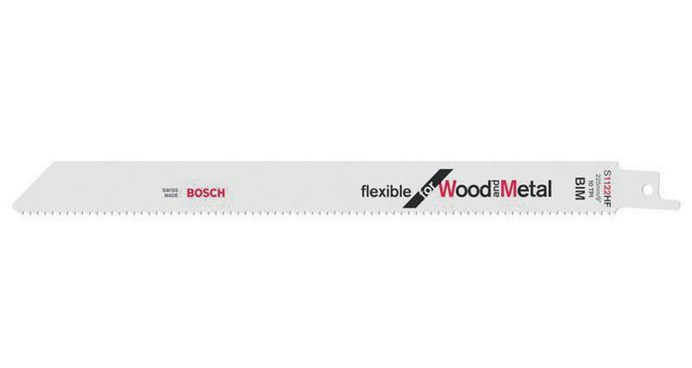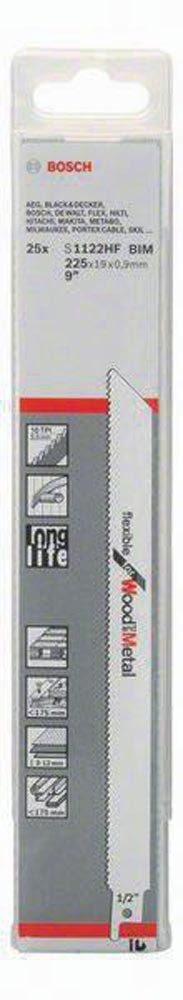 Säbelsägeblatt S 1122 HF. Flexible for Wood and Metal. Werkstoff: BIM. Zahnausführung: geschränkt · gefräst. Für Palettenreparatur. Einsatzbereiche: Für Holz mit Nägeln/Metall (kleiner als 175 mm Stärke) · für Metallbleche · Rohre · Aluminiumprofile (von 3 bis 12 mm Stärke). Flexibler Bündigschnitt. Inhalt der Verkaufsverpackung: 25 Stück.