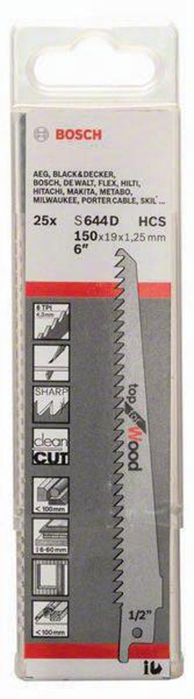Säbelsägeblatt S 644 D. Top for Wood. Werkstoff HCS. Zahnausführung: geschränkt · geschliffen. Einsatzbereiche: Für Konstruktionsholz (kleiner als 100 mm Stärke) · für Holzwand (kleiner als 100 mm Stärke) · für Platten: Span · MDF (von 6 bis 60 mm Stärke) · für Sperrholz · Kunststoff (kleiner als 100 mm Stärke). Speziell für Tauchschnitt. Inhalt der Verkaufsverpackung: 25 Stück.