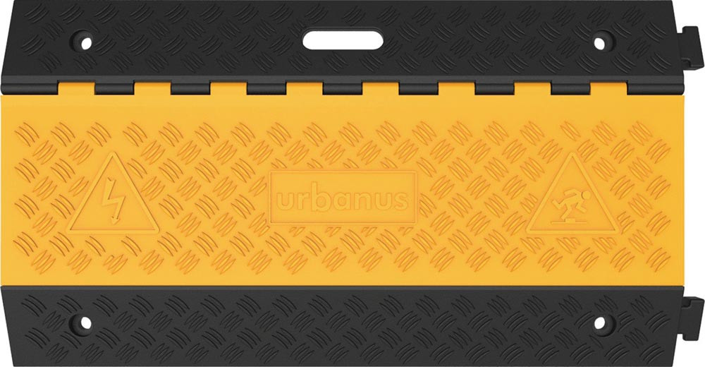 mit fünf Kanälen · zum Schutz von Schläuchen oder Kabeln, die nicht dauerhaft verlegt sind · Abmessung Kabelkanäle H 35,3 x B 38 mm · keine Befestigung nötig · aus schwarzem vulkanisiertem Vollgummi und rutschhemmende Oberfläche · mit gelben Schutzdeckel und Tragegriff · überfahrbar bis zu einem Achsgewicht von 8 t · Endlosmontage mit Zapfen/Nut-System