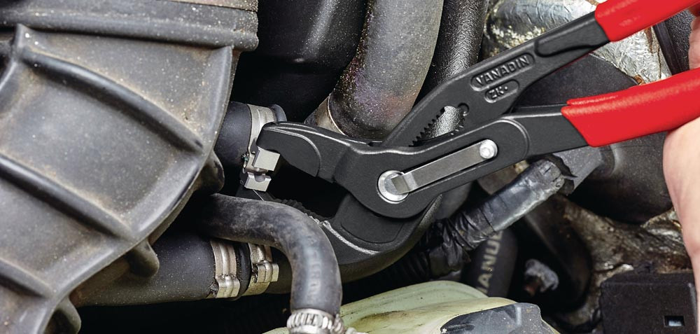zum Öffnen und Schließen von Click-Schellen, z. B. an Kraftstoffschläuchen, Unterdruckleitungen und Ansaugstutzen · Zusatzfunktion: Schläuche schonend lösen durch gezahntes Greifmaul · schlanker Kopf, geringe Kopfbreite: ideales Werkzeug gerade unter beengten Verhältnissen · Chrom-Vanadin-Elektrostahl, geschmiedet, ölgehärtet