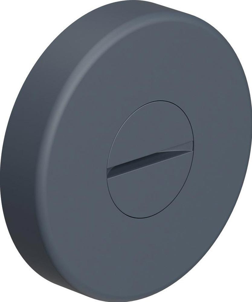 WC-Rosette lange Nocken · Außenrosette mit Schauscheibe (Anzeige rot/weiß) und Notöffnung mittels Münze (FBM) · Polyamid durchgängig eingefärbt · Rosettenunterkonstruktion aus Kunststoff · DIN links und DIN rechts verwendbar · in das Türblatt eintauchenden Stützdehnzapfen · Rosetten-Abdeck-Kappe, rund, Durchmesser 55 mm, 10,5 mm hoch, 1,5 mm Wandstärke · Edition matt