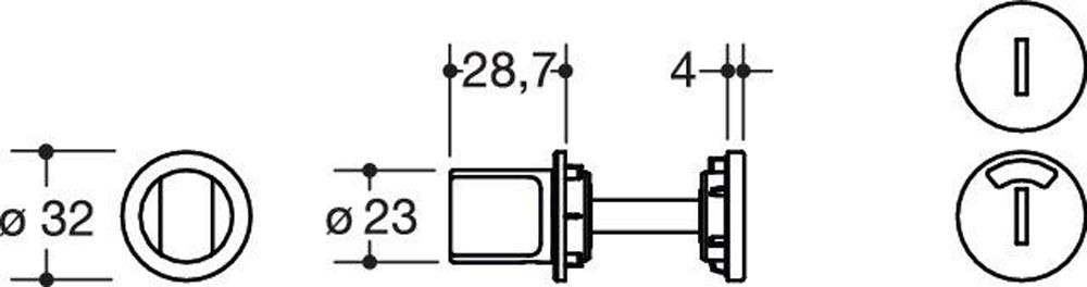 WC runde Form aus Polyamid · Ø 32 mm · Ausführung mit Notöffnung Münze ohne Schauscheibe · Schildstärke innen 3 mm / außen 4 mm · das Fräsmaß für die Montage von WC-Rosetten muss ein Nennmaß von 25 mm aufweisen · Einsatz in Verbindung mit Einsteckschlössern nach DIN 18251