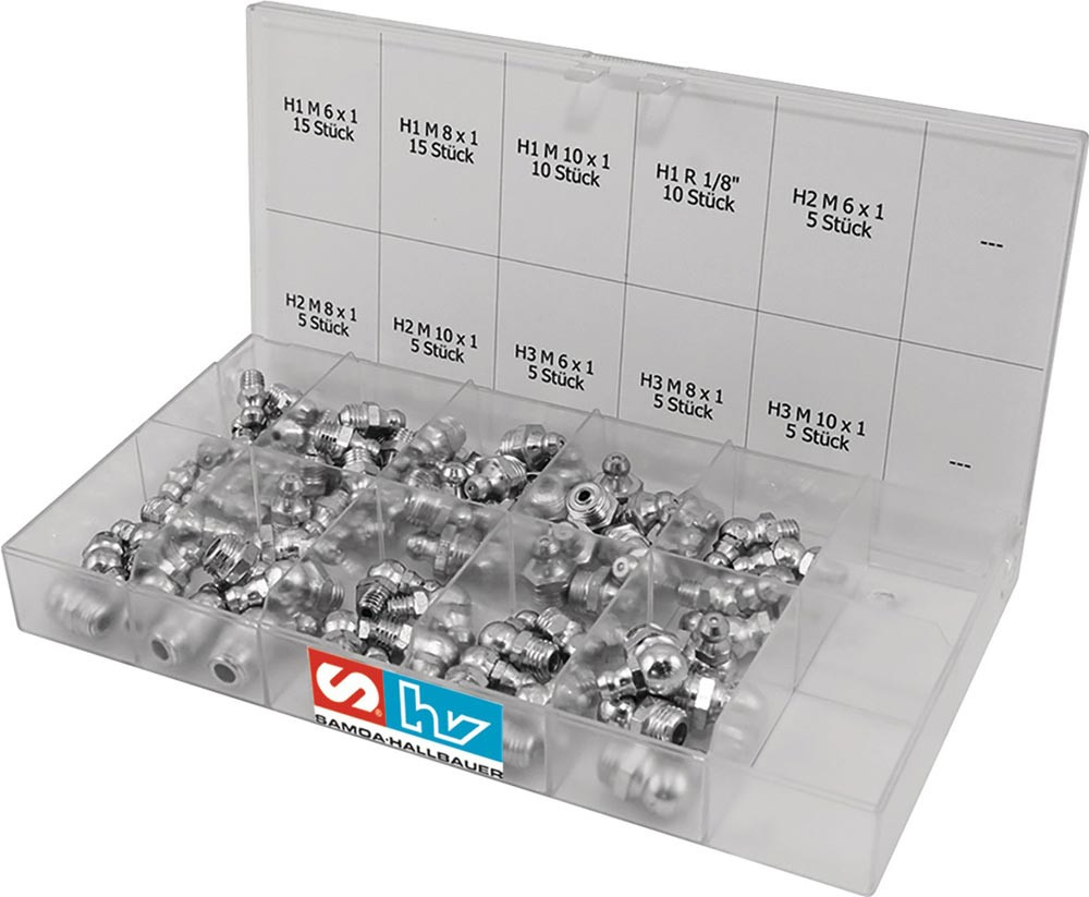 Stahl, glanzverzinkt und passiviert · M6, M8, M10, 3 mm (R1/8″) · in Box · Inhalt: 15 St. H1 M6 x 1, 15 St. H1 M8 x 1, 10 St. M10 x 1, 10 St. H1 R1/8, 5 St. H2 M6 x 1, 5 St. H2 M8 x 1, 5 St. H2 M10 x 1, 5 St. H3 M6 x 1, 5 St. H3 M8 x 1, 5 St. H3 M10 x 1