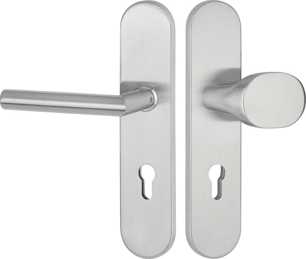 ZT-EN2 Wechselgarnitur mit Langschild 2089 S, Knopf 3128 gekröpft · Außenschild bestehend aus Stahl Unterkonstruktion mit gehärteter Außenplatte und Edelstahl Dekor-Abdeckschild, unsichtbar verschraubt · gehärtete Stahlnocken zur Aufnahme der Gewindeschrauben · 3-fach M6 Verschraubung mit Stahlschrauben und Gewindestopp · Knopf links / rechts verstellbar mit integrierter Verdrehsicherung · Innenschild mit Stahl-Unterkonstruktion und Edelstahl Dekor-Clipschild unsichtbar verschraubt. Drücker fest gelagert · Ausführung PZ gelocht · Aussenschild 12 mm stark