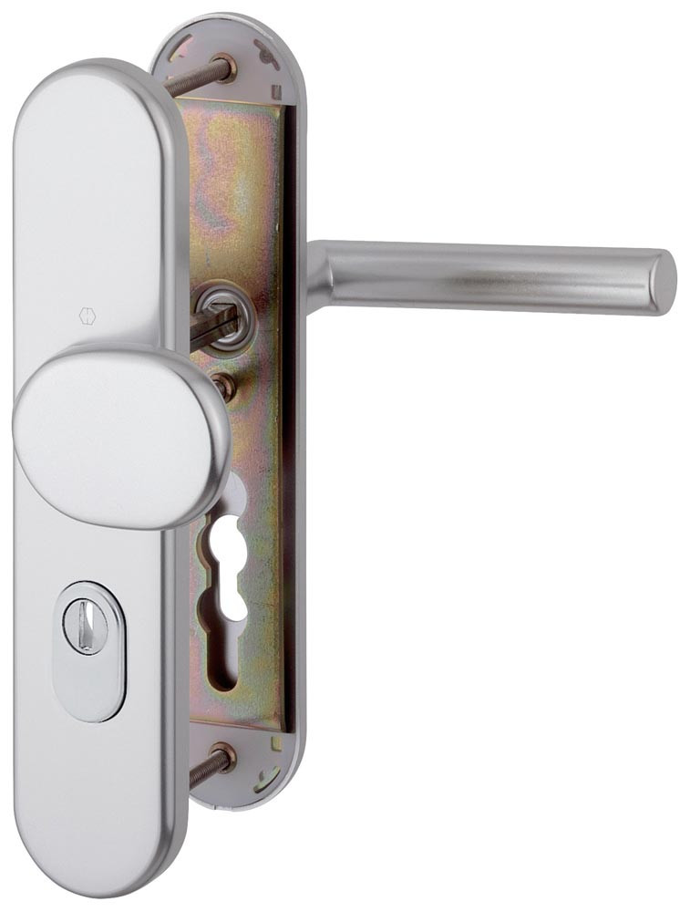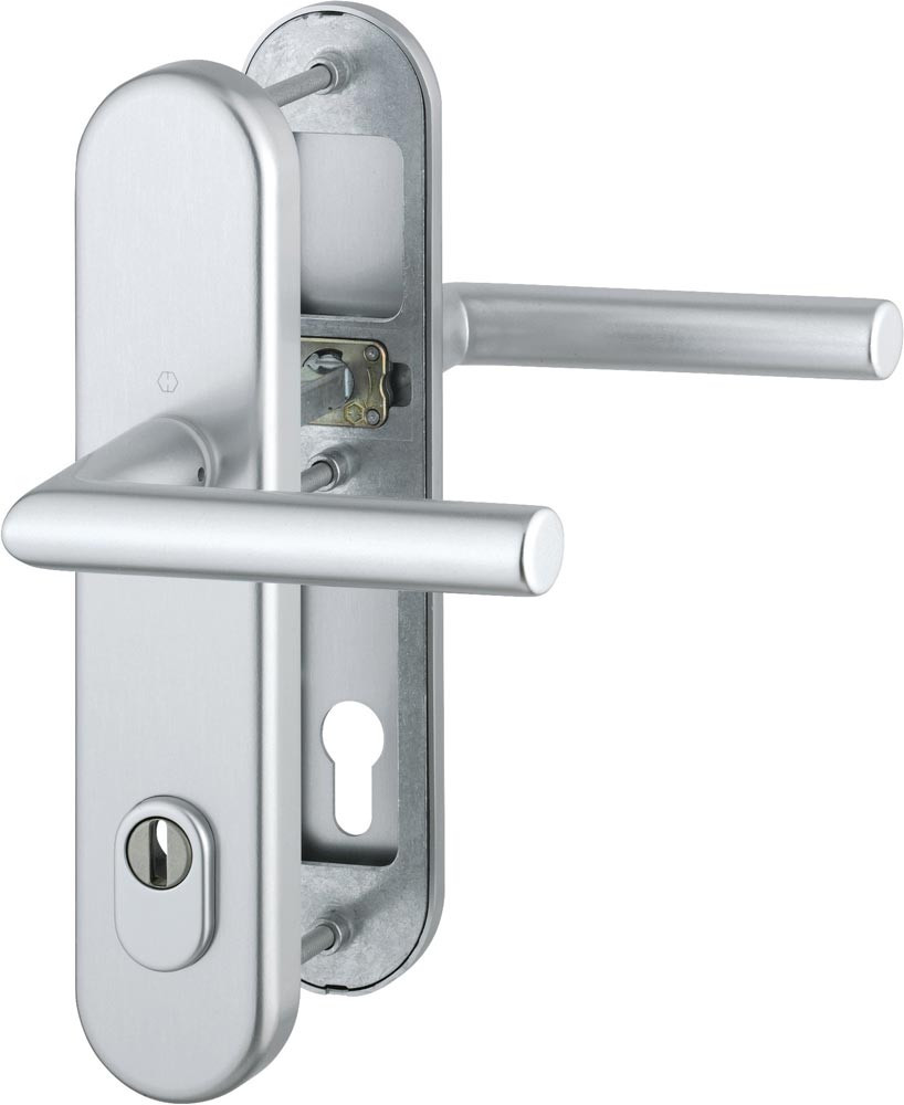 für Abschlusstüren · einbruchhemmend nach DIN 18257 · Stahl-Unterkonstruktion im Außen- und Innenschild · mit Rückholfeder-Paket · mit Zylinderabdeckung aus gehärtetem Stahl für vorstehende Zylinderlänge 10-18 mm · innen: loser Türgriff, mit Schnellstift-Verbindung · hochfeste, verdeckte Verschraubung · Knopfschild-Randhöhe: 15 mm · Lochung PZ · DIN links / rechts · einschließlich Befestigungsmaterial · Widerstandsklasse ES 1