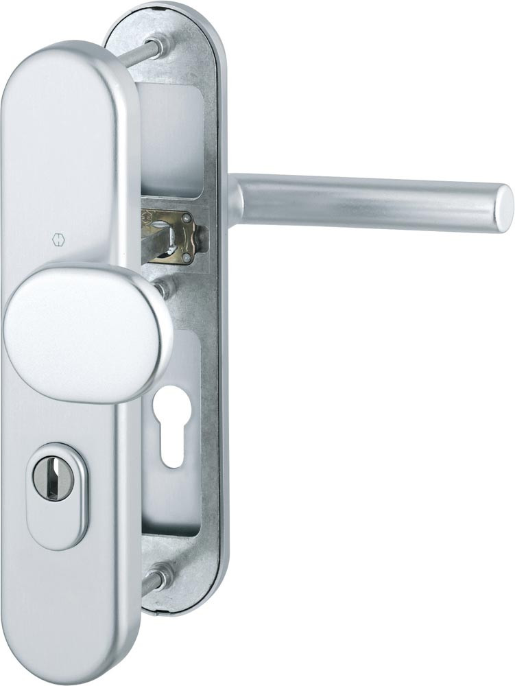 für Abschlusstüren · einbruchhemmend nach DIN 18257 · Stahl-Unterkonstruktion im Außen- und Innenschild · mit Rückholfeder-Paket · mit Zylinderabdeckung aus gehärtetem Stahl für vorstehende Zylinderlänge 10-18 mm · innen: loser Türgriff, mit Schnellstift-Verbindung · hochfeste, verdeckte Verschraubung · Knopfschild-Randhöhe: 15 mm · Lochung PZ · DIN links / rechts · einschließlich Befestigungsmaterial · Widerstandsklasse ES 1