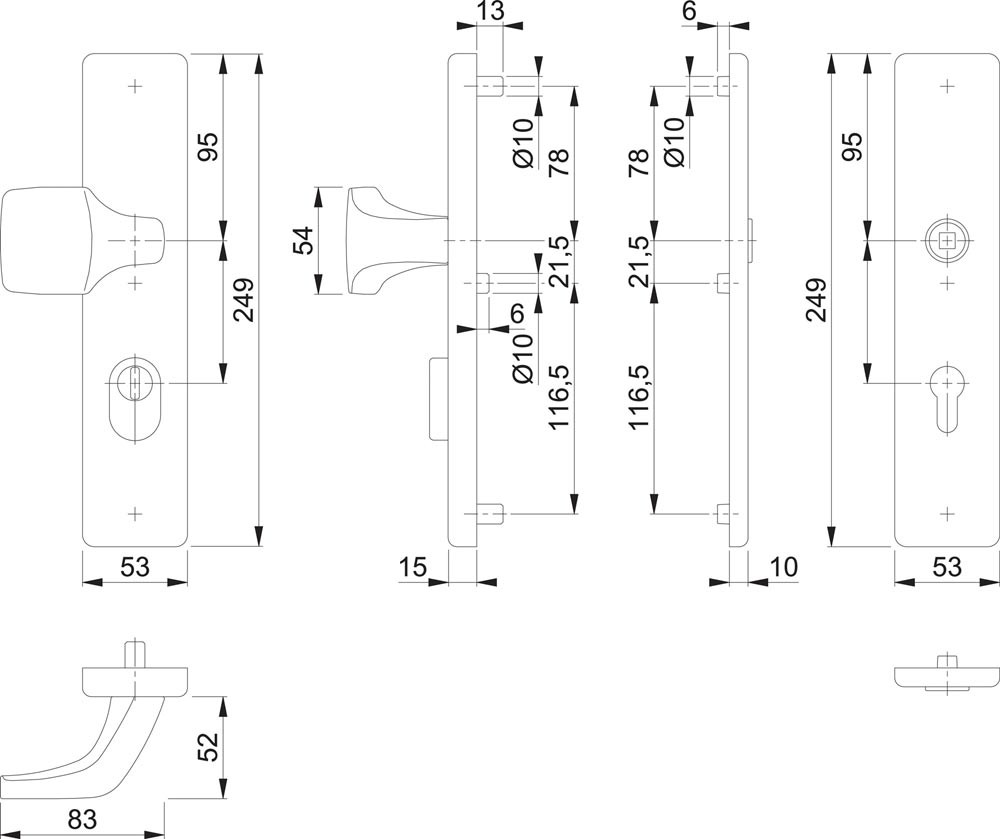 Lagerung: außen gekröpfter Knopf fest, ummontierbar, innen für Türgriff lose, Rückholfeder rechts/links verwendbar, wartungsfreies Gleitlager